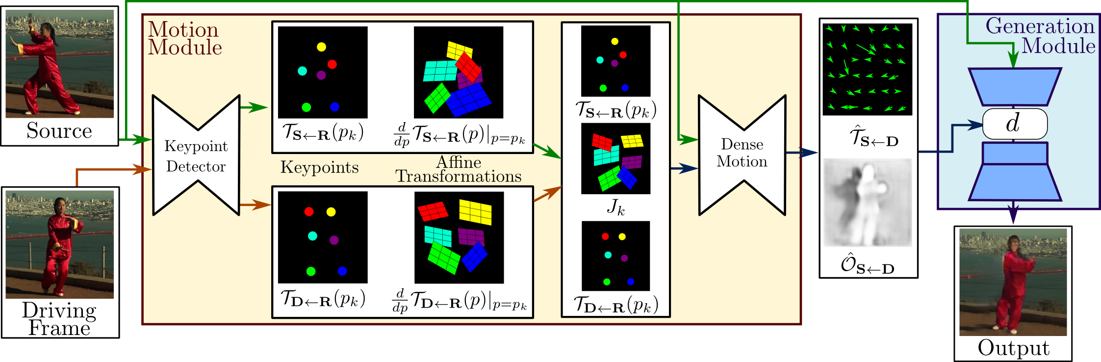 source는 변환을 주고싶은 이미지가 되고 driving frame은 동영상의 프레임을 의미한다. 크게보면 Motion Module과 Generation Module로 이루어져 있는 것을 볼 수 있다. Motion Module은 영상에서 dense motion field를 예측하는 목적을 갖는 모듈이라고 한다. 즉 움직임에 대한 특징을 추출한다고 이해하였다. keypoints Detector 모델에서 영상속 인물의 특징점이라 할 수 있는 Keypoints와 각 Keypoint들이 서로를 고려한 Affine Transformations 값을 찾게 된다. Affine Transformations에 대해 검색해보니 동작이나 움직임을 모델링하는데 있어서 벡터에서 '위치' 정보를 추가로 고려하는 Affine Transformations이 유용해 보였다. 이후 Dense Motion 모델을 통해 dense motion field와 occlusion mask를 출력하게 된다. dense motion field는 motion field를 좀더 세밀하게 찾았다는 의미가 아닐까 생각되고 motion field의 경우 화살표를 통해 움직임을 표현한 모습이라고 알 수 있었다. occlusion mask의 경우 검색해보니 뭔가 가려진 부분에 관련된 것으로 추정된다. 아마도 source 이미지는 2d이다보니 source 이미지 속 인물의 포즈를 변경하려면 가려진 이미지에 보이지 않는 부분을 추정하기 위한 mask라고 생각된다. Generation Module에서는 출력된 dense motion field와 occlusion mask를 고려하여 source 이미지를 변형시킨 후에 occluded(가려져서 보이지 않았던) 부분을 생성하게 된다.